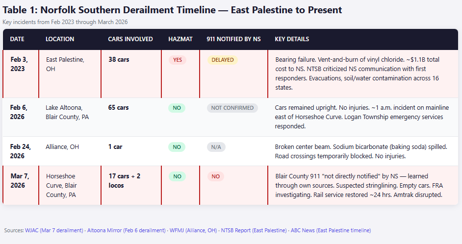 Editor’s note (March 30, 2026): After publication, Norfolk Southern shared additional information about its notifications to first responders in Blair County.