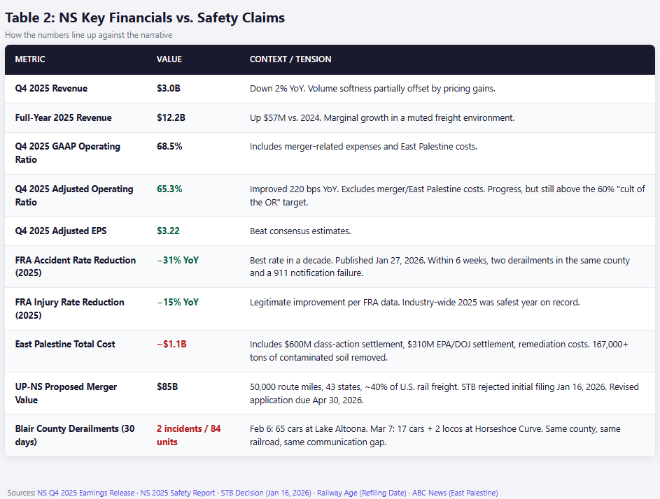 Norfolk Southern built a careful narrative for the merger: improving safety, disciplined financials, ready to scale. Blair County cracked that narrative in the one place NS can least afford it — trust. Not the numbers on the FRA report, but the basic question of whether the railroad picks up the phone when something goes wrong.